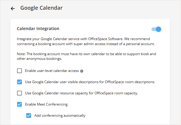 If you'd like to use Google Meet as video conferencing for your meeting, you can do so thanks to OfficeSpace's Google Calendar Integration.