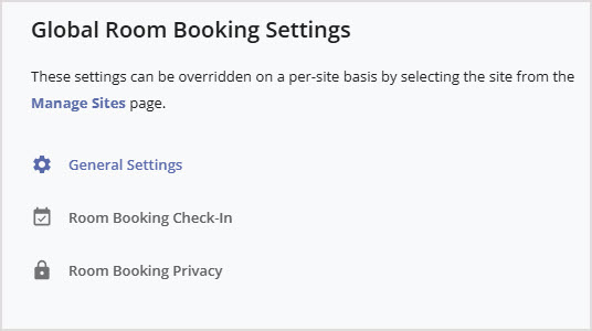 The Global Room Booking Settings screen opens. There are two sections of available configurations: the General Settings and the Room Booking Check-In settings. You can use the navigation bar on the left to jump to each section.