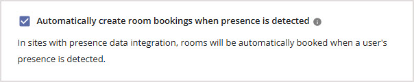 This setting automatically creates room bookings when a user's presence is detected in a room at a site with presence data integration. It helps ensure room usage is accurately tracked without needing manual check-ins.