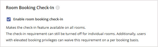 To adjust the settings for Room Booking Check-In, you will first need to enable room booking check-in. Select the Enable room booking check-in checkbox to enable this setting.