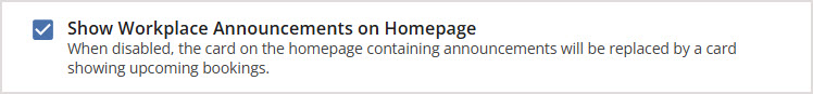 You can choose to Show Workplace Announcements on Homepage by marking the checkbox. Employees will see a dedicated card on the Employee Homepage displaying Workplace Announcements.
