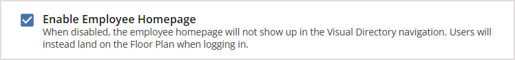 Mark the checkbox next to Enable Employee Homepage to show the Employee Homepage to all Visual Directory users as part of their navigation. If the Employee Homepage is not enabled, users will bypass the homepage and go straight to the Floor Plan view instead.