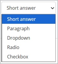 You may choose between short answer, paragraph, dropdown, radio or checkbox.