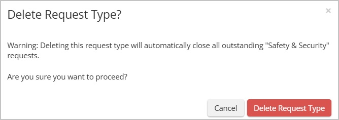 A confirmation pop-up will appear. If there are any active requests with the request type, you'll receive a warning that the active requests will be automatically closed. Select Delete Request Type to confirm the action.