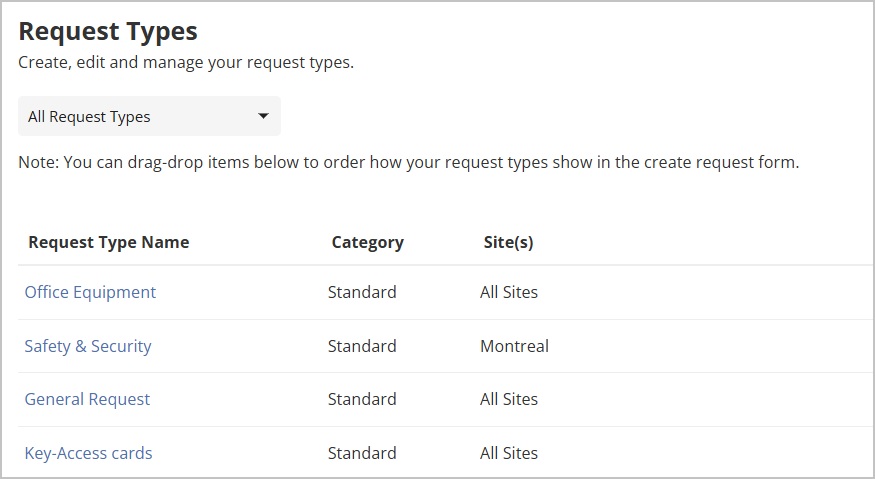 Before your employees can begin submitting requests, your management team needs to create their request types. Request types allow you categorize the types of requests that can be submitted and set the specific details that need to be provided for each type. A standard request is a service request created in Request Manager that isn’t linked to a room, such as a general maintenance, IT, or facilities request. A Meeting (Room Booking) request is a service request created directly from a room booking, linking services like catering, IT, or room setup to the scheduled meeting. After your organization’s request types are created, Request Managers can then subscribe to view and manage their desired request types. Request types are managed under the settings in Request Manager.