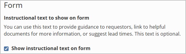 Mark the checkbox to show instructional text with the request form, if you wish to enable instructional text for the request type.