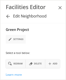 Choose the Neighborhood you want to edit by selecting it on the floor plan. Using the icons, choose whether you want to change the Neighborhood settings, redraw parts of it, delete a section, or add a new section.