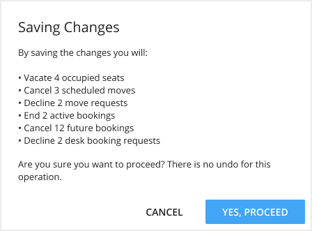 A modal then pops up, which lets you know if your changes affect any other moves, bookings or items in your floor plan.