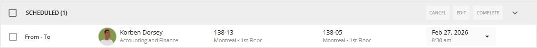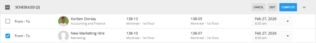 The Moves Log Tab helps you review move-related activity that happened in the scenario. Use it to see what moves were created in this scenario before you publish changes to the live floor. If anything looks unexpected, return to your scenario floor to make updates before you continue. You can schedule, edit, complete or cancel moves from this screen.