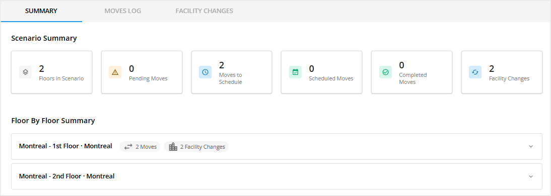 The Summary Tab gives you a high-level preview of what you’re about to publish from your scenario to the live floor. Use it to confirm you’re in the right scenario and reviewing the right managed (live) floor. It also shows an at-a-glance overview of the changes queued for publishing before you review details in the Moves Log and Facility Changes tabs.