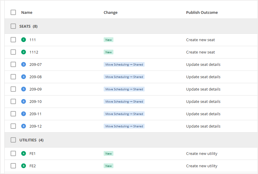 The Facility Changes tab shows the updates to the floor plan in your scenario that can be published to the live floor.
