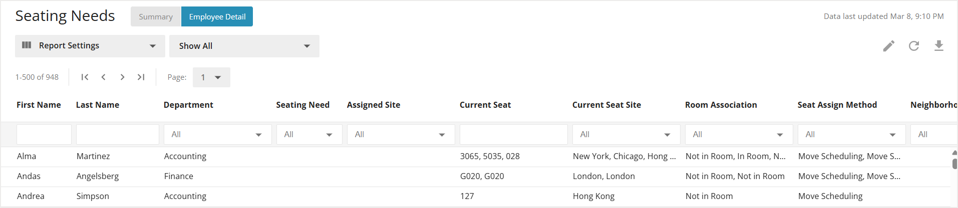 The Employee Detail tab shows a list of all your active employee records with key information about their seating needs, current seating arrangement, and Neighborhood assignments.